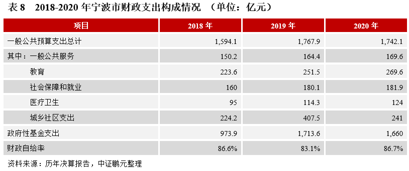(2)財(cái)政支出:近三年寧波市一般公共預(yù)算支出規(guī)模變動(dòng)不大,主要支出偏向教育、社保、醫(yī)療和城鄉(xiāng)社區(qū)等剛性支出。2020年,寧波市一般公共預(yù)算支出共計(jì)1,742.1億元,支出結(jié)構(gòu)與以往年度基本一致;2020年政府性基金支出較上年變化不大,以國(guó)有土地使用權(quán)出讓相關(guān)支出為主。此外,寧波財(cái)政自給程度很高,2020年財(cái)政自給率較上年提升3.6個(gè)百分點(diǎn)至86.7%(見表8)。
