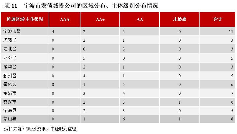 截至2021年10月末,寧波共有62家發(fā)債城投公司(以本文甄選標(biāo)準(zhǔn)作為依據(jù))。從主體信用級(jí)別來(lái)看,AAA級(jí)共4家,AA+級(jí)共24家,AA級(jí)共32家,還有2家未披露其主體級(jí)別。從所屬區(qū)域來(lái)看,寧波市級(jí)共11家,象山縣8家,余姚市7家,奉化區(qū)和慈溪市各有6家,鄞州區(qū)、北侖區(qū)和寧海縣各有5家,海曙區(qū)、江北區(qū)和鎮(zhèn)海區(qū)各有3家(見表11)。受制于區(qū)域經(jīng)濟(jì)財(cái)政實(shí)力水平和資源協(xié)調(diào)能力,寧波的區(qū)縣級(jí)城投公司中沒有AAA級(jí)高等級(jí)主體,但卻不乏AA+級(jí)和AA級(jí)主體,區(qū)縣級(jí)城投公司數(shù)量在全部AA+級(jí)主體和全部AA級(jí)主體中的占比分別達(dá)到91.67%和84.38%。