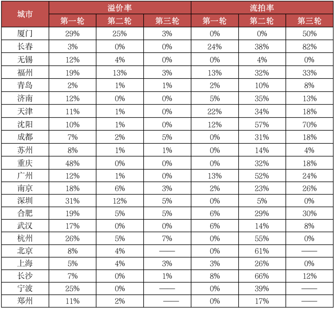 就重點城市集中土拍情況來看,超半數(shù)城市三輪集中供地成交量遞減,地價整體降幅達5%;熱度來看,首輪土拍熱度最高,二、三批次集中土拍市場熱度明顯下降,溢價率大幅下滑、流拍率持續(xù)攀升。