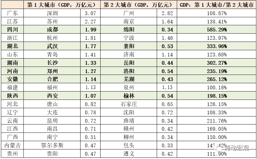 絕大部分省級(jí)行政區(qū)的第1大城市為其省會(huì),但有6個(gè)地區(qū)是例外。具體看,廣東的第1大城市是深圳而非廣州,江蘇的第1大城市是蘇州而非南京、山東的第1大城市是青島而非濟(jì)南、河北的第1大城市是唐山而非石家莊、遼寧的第1大城市是大連而非沈陽(yáng)、內(nèi)蒙古的第1大城市是鄂爾多斯而非呼和浩特。