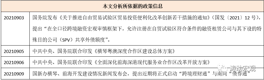 2021年9月5日與6日發(fā)布的兩個《方案》明確了兩大合作區(qū)未來15年(兩個方案均展望至2035年)的發(fā)展目標(biāo)與舉措,里面提出的一系列支持政策預(yù)計后續(xù)還會有相關(guān)配套細則出臺,如9月9日央行副行長潘功勝便透露“央行正牽頭港澳金融管理部門制定金融支持兩地改革開放的專門文件”。同時考慮到廣州南沙新區(qū)、深圳前海蛇口以及珠海橫琴新區(qū)均屬于廣東自貿(mào)區(qū),因此這里將《關(guān)于推進自由貿(mào)易試驗區(qū)貿(mào)易投資便利化改革創(chuàng)新若干措施的通知》納入進來。