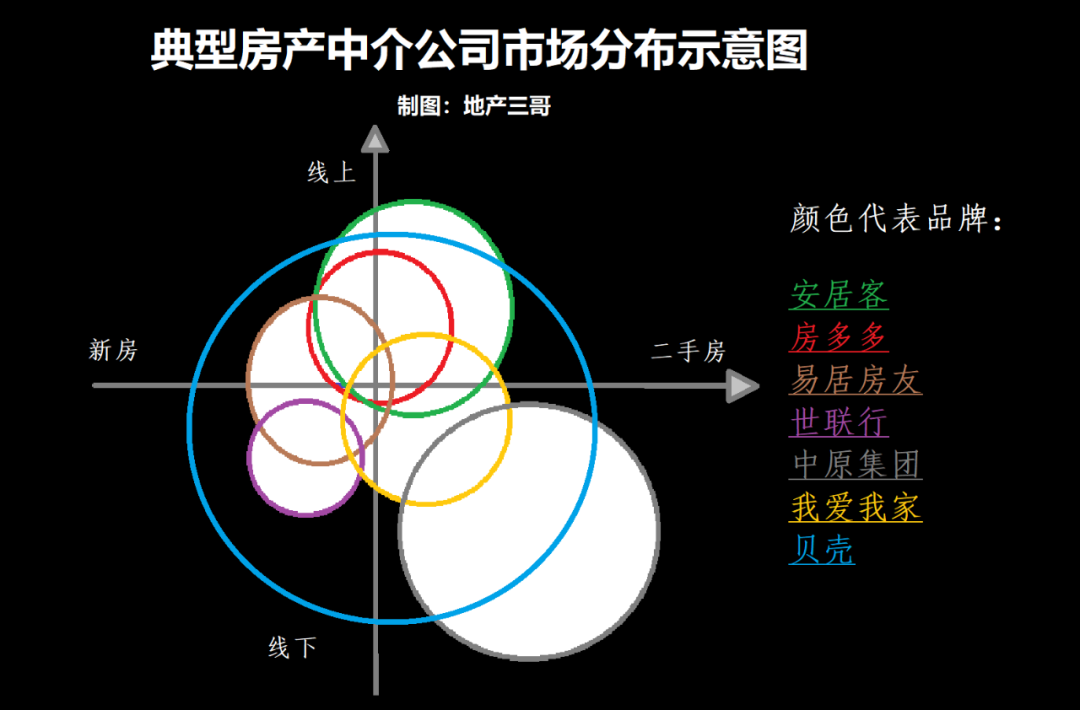 如果按照線上、線下、新房、二手房對房產中介市場進行坐標細分,那么各家品牌的示意圖大致如下: