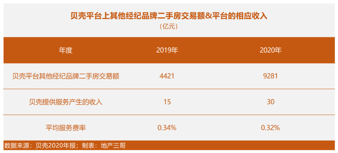 2019-2020年,貝殼平臺對其他經紀品牌二手房交易額收取的服務費率0.34%、0.32%。