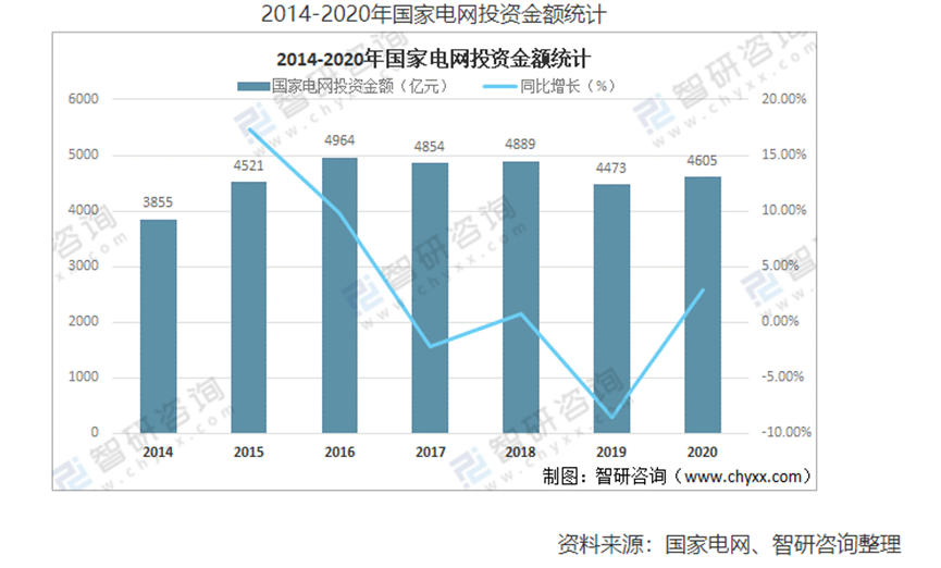 2020年國家電網(wǎng)投資金額達(dá)4605億元,較2019年增加了132億元,同比增長2.95%,2021年國網(wǎng)計劃投資4730億元。