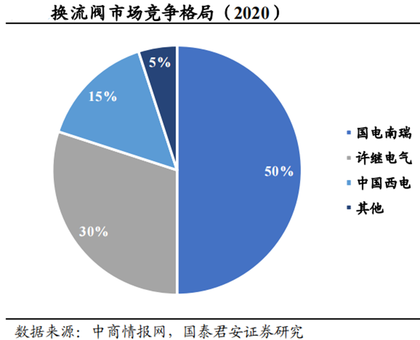 從2020年的換流閥市場競爭格局來看,國電南瑞占據(jù)半壁江山,其次是許繼電氣和中國西電。