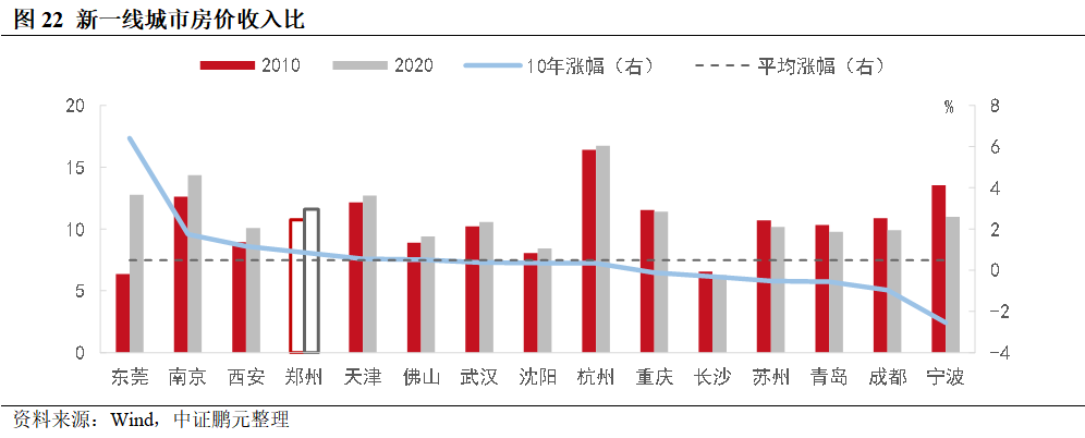 與14個其他新一線城市相比,近十年來鄭州的人口增速位于第三位,大專及以上人口占比位于第三,城鎮化率位于第十二位,人均可支配收入位于第十三位。鄭州快速擴張的城市規模,吸引了更多的年輕人到鄭州,但工資水平和就業環境長期相對一般。雖然,較低城鎮化率給予了再發展空間,“如何留住人”是關鍵,包括農民轉移就業人口和大學畢業生等高等人才。