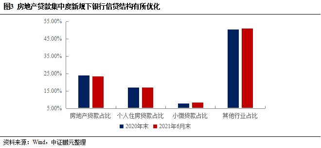 (1)房地產貸款集中度監(jiān)管政策實施較為有效,商業(yè)銀行集中度超標情況有所好轉,信貸結構有所優(yōu)化。自2020年末房地產集中度管理制度實施以來,截至2021年6月末,原39家上市銀行中有28家銀行房地產貸款集中度指標出現(xiàn)一定程度下降,平均房地產貸款占比下降0.46個百分點。另一方面,銀行新增信貸資金更多投向小微企業(yè)和非房地產領域,信貸結構有所優(yōu)化。