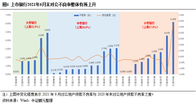 從有完整可比數(shù)據的26 家上市銀行來看,國有六大行2021年6月末平均對公房地產貸款不良率為3.04%,較 2020年末上升0.49個百分點,主要受工商銀行房地產不良率大幅上升1.97個百分點至 4.29%的影響;股份制銀行2021年6月末平均對公房地產貸款不良率為1.32%,較2020年末提升0.3個百分點,部分區(qū)域中小型銀行地產不良率上升較快,如渝農商行地產不良率大幅提升至6.18%,主要由于個別房地產企業(yè)因流動資金緊張,在建項目發(fā)生停工所致。