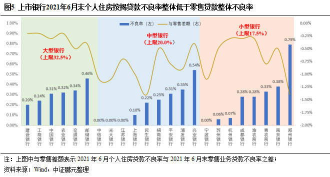 個人住房按揭貸款資產質量方面,上市銀行個人住房貸款不良率低位穩(wěn)步下行,顯著低于零售貸款整體不良率。從有完整可比數(shù)據的26 家上市銀行來看,國有六大行2021年6月末個人住房按揭不良率為0.28%,較2020年末下行2bp;股份制銀行住房按揭不良率為0.24%,較2020年末下行1bp;區(qū)域性城農商行除鄭州銀行上行27bps較為明顯外,其余均保持低位。整體來看,政策發(fā)布半年以來上市銀行個人住房貸款不良率變化不大。另一方面,上市銀行個人住房貸款不良率整體處于低位運行,顯著低于零售貸款整體不良率,整體資產質量較高。