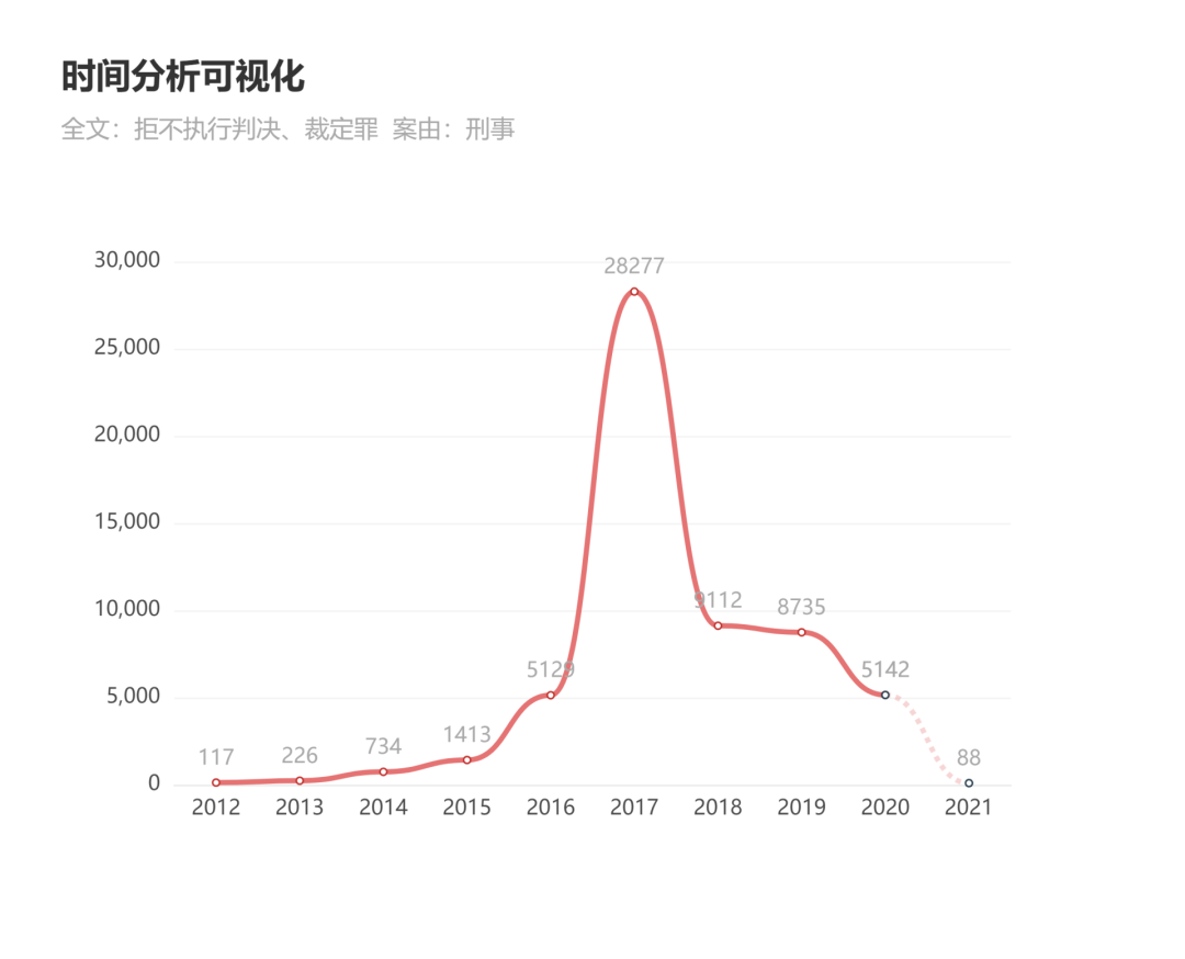 根據(jù)第三方數(shù)據(jù)平臺(tái)的裁判文書數(shù)據(jù)顯示,拒執(zhí)罪在2016年前基本沒(méi)有太多應(yīng)用。2016年到2020年期間,呈上升態(tài)勢(shì),但也均未超過(guò)1萬(wàn)(注:2017年數(shù)據(jù)28277件中,河南省貢獻(xiàn)25381件,屬于當(dāng)年的個(gè)別偏差現(xiàn)象)。