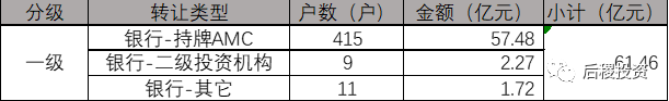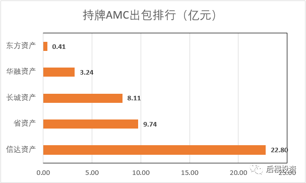 持牌AMC出包金額超過40億,包括了持牌AMC-持牌AMC、持牌AMC-其它和二級(jí)投資機(jī)構(gòu)等多種轉(zhuǎn)讓模式。