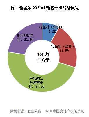 多元渠道擴充土儲,七成非招拍掛取得。除招拍掛市場外,雅居樂還通過收并購、產城融合、城市更新等方式補充土儲,這部分新增土儲建面占比達70.2%,相比2020年增長15.2個百分點。其中,產城融合和城市更新共計占比47.7%、收并購占22.5%。值得一提的是,當前通過產城融合和城市更新鎖定的預計土儲建面分別為2410萬平方米和1377萬平方米,待未來納入土儲后,這部分占比將進一步提升,顯然已成為企業重要的拿地手段。
