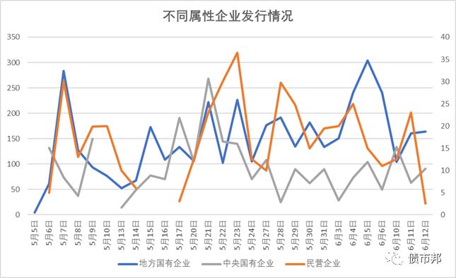 從不同評級發(fā)行情況來看,AAA級發(fā)行人和AA發(fā)行人保持了一致的發(fā)行節(jié)奏,沒有出現AAA瘋搶AA遇冷的情況;從不同所有制企業(yè)發(fā)行情況來看到,也沒有發(fā)現民企債被拋棄的情況(民企債券以前沒有好發(fā),現在也談不上拋棄)