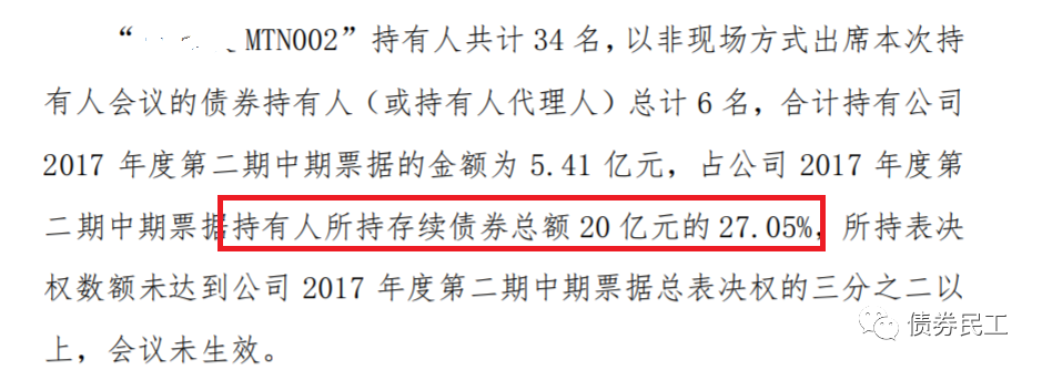 持有人會(huì)議未生效的主要原因是參會(huì)的持有人數(shù)不夠,注意是參會(huì)人數(shù)未達(dá)到約定的標(biāo)準(zhǔn),不是投反對(duì)票的人數(shù)。但是也真沒想到,部分債券持有人會(huì)議的參會(huì)比例會(huì)是如此之低。讓我們一起來看幾個(gè)近期未生效的債券持有人會(huì)議案例: