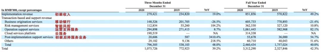 交易運營收入則是除完成平臺建設外,還繼續為客戶提供技術支持和運營服務,具體包括——移動銀行、智能風控、運營支持服務、初裝后持服務業務,以及云服務。