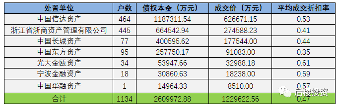 從阿里拍賣平臺中篩選出浙江地區債權(超過1000萬)成交記錄,總成交戶數1497戶,成交債權總本金341.6億,總成交價157.8億元,其中持牌AMC出讓比重接近80%。