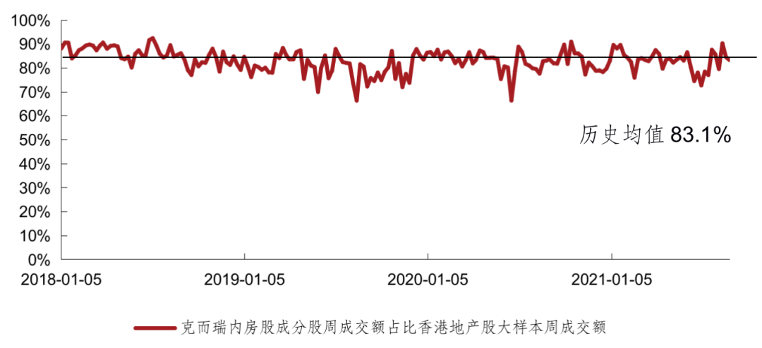 從成交額來看,8月克而瑞內房股領先指數成交額占香港地產股大樣本的成交額比值總體較上月有小幅提升,該指數成交額占比周均值84.5%,高于歷史均值83.1%,高于上月周均值80.4%。
