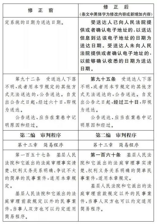 三、《草案》第九十條將電子送達途徑由“傳真、電子郵件等”改為“電子方式”,同時將現(xiàn)行的“但判決書、裁定書、調(diào)解書除外”改為“通過電子方式送達的判決書、裁定書、調(diào)解書,受送達人提出需要紙質(zhì)文書的,人民法院應(yīng)當提供”。