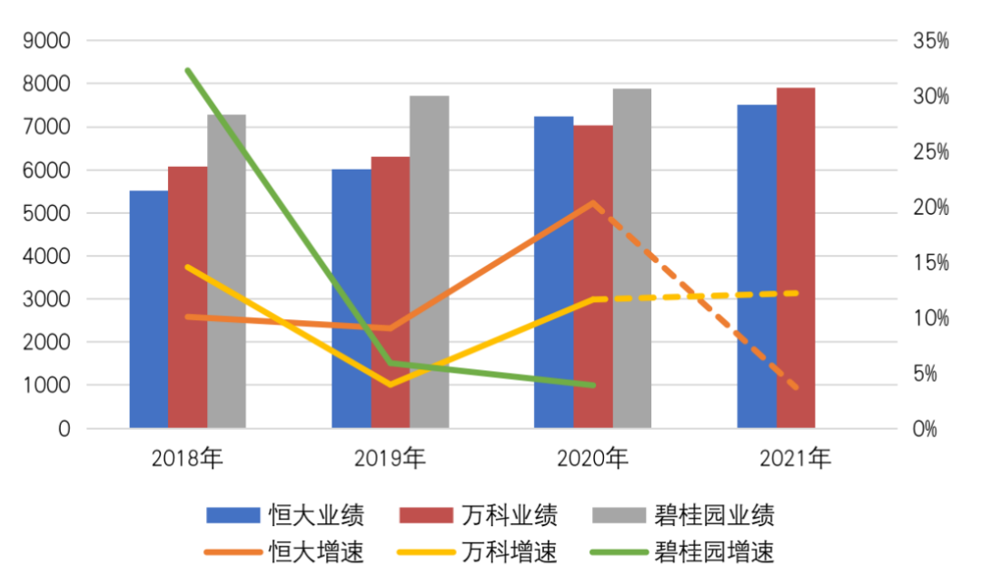 萬(wàn)科將2021年銷售目標(biāo)定在7900億元,意味著2021年增長(zhǎng)率要達(dá)到12%。目前,行業(yè)前三銷售規(guī)模均超過(guò)了7000億元,分別是碧桂園、恒大、萬(wàn)科,其中,碧桂園于2018年突破7000億,隨后2年都保持了個(gè)位數(shù)的低速增長(zhǎng),恒大在大跨步邁入7000億之后,將2021年的銷售目標(biāo)定在7500億,增速降至3.7%,僅萬(wàn)科在行業(yè)“零增長(zhǎng)”甚至是“負(fù)增長(zhǎng)”預(yù)期下,選擇“高位起跳”。