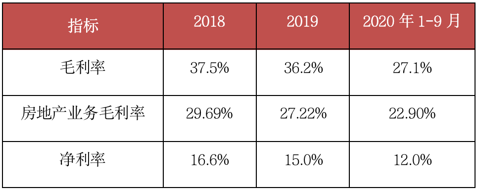 數(shù)據(jù)顯示,近兩年來(lái),萬(wàn)科無(wú)論是毛利率還是凈利率都在走低,2020年1-9月毛利率為27.1%,其中房地產(chǎn)開發(fā)及相關(guān)資產(chǎn)經(jīng)營(yíng)業(yè)務(wù)收入毛利率為22.9%,凈利率為12%,都低于前兩年水平。