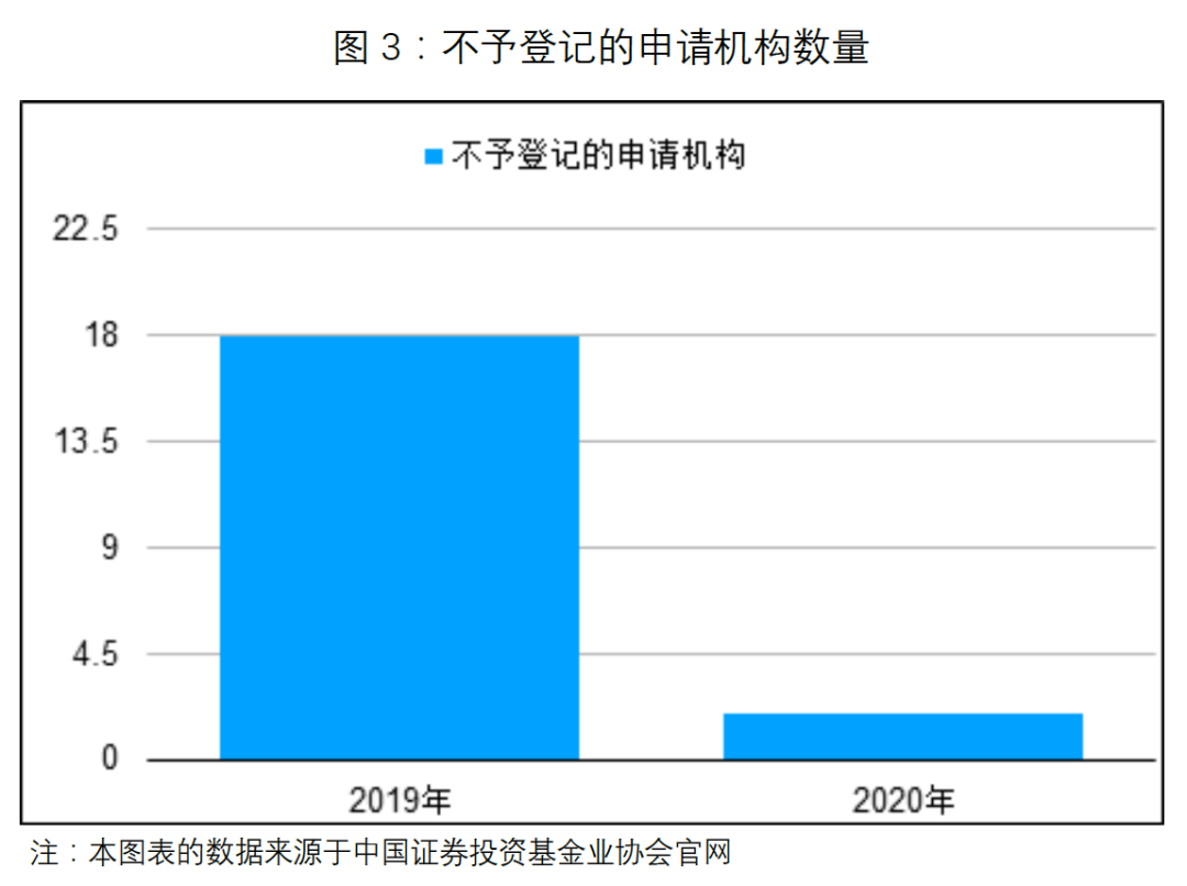 2019年中基協(xié)不予登記的申請機構共18家,2020年中基協(xié)不予登記的申請機構共2家。