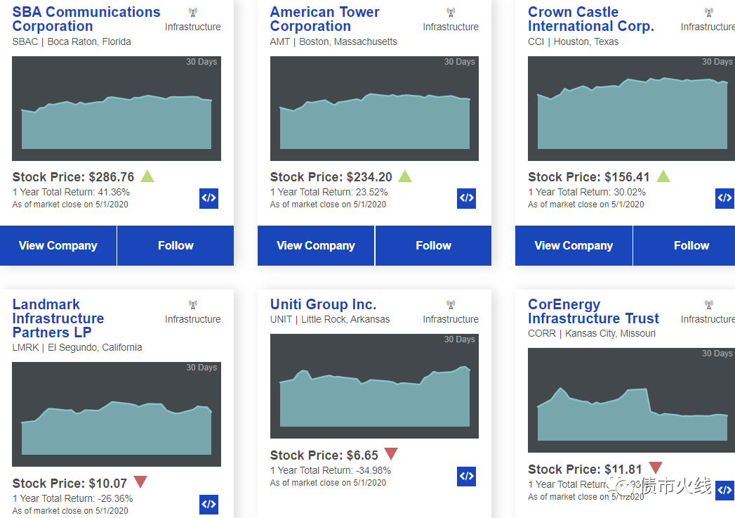 截至目前,根據(jù)Nareit網(wǎng)站披露的信息,美國基礎(chǔ)設(shè)施REITs(infrastructure REITs)一共有六只,如下圖所示: