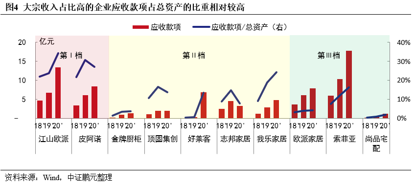 本次房企風險暴露,通過大宗業務傳導,直接影響定制家居企業的收入及回款。大宗業務“量大利薄賬期長”,會拖累企業應收款項周轉效率,導致其經營現金流弱化,甚至引發回款風險,已有江山歐派、皮阿諾、頂固集創、我樂家居等企業被曝持有的恒大商票等款項逾期;大宗業務毛利率本就低于零售渠道且呈下降趨勢,未來如轉向同優質房企合作,預計毛利率仍將承壓。相比之下,龍頭企業受影響較小,中部、尾部企業受波及程度大,大宗業務占比高、合作房企負債率高的企業影響更甚。