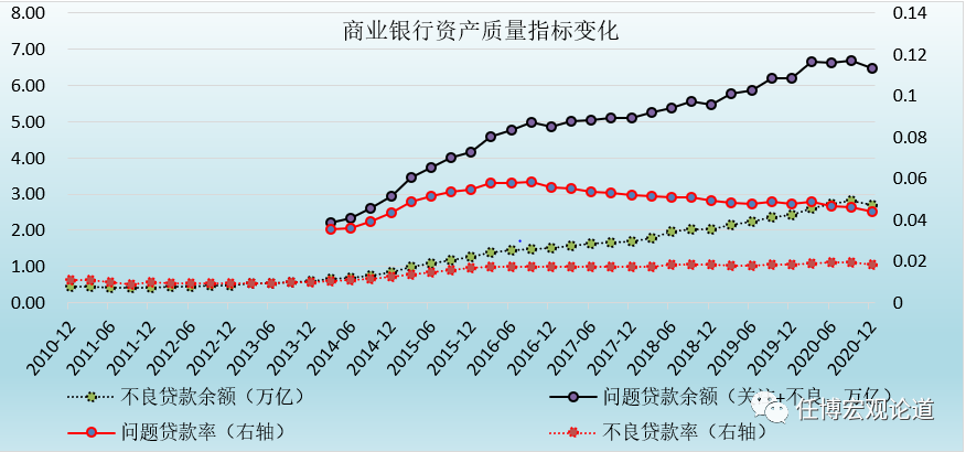 1、2012年以來,我國商業(yè)銀行資產質量開始趨于惡化,不良貸款余額增至2.70萬億元、問題貸款余額亦相應增至6.48萬億,不良貸款率提升至1.84%。若不考慮2020年的延期還本付息等政策,則目前我國不良貸款余額和不良貸款率將分別為3萬億和2%以上。