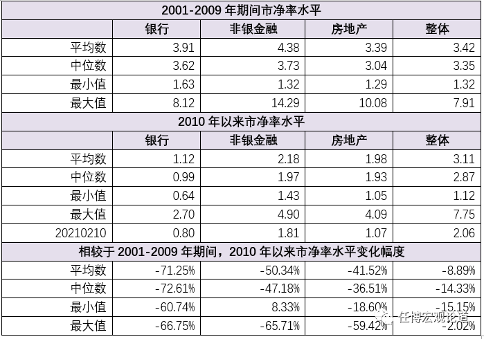 以平均數(shù)為例,整體A股市場的市凈率從2001-2009年期間的3.42倍降至2010年以來的3.11倍,下降幅度達8.89%。與之相對應,銀行、非銀金融與房地產在此期間的市凈率下降幅度亦分別達到71.25%、50.34%和41.52%。