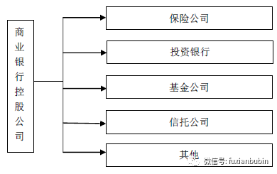 金融集團模式,也可稱為母子公司模式,根據母公司的行業屬性,又可以分為兩類。第一類是母公司除了從事一定范圍的金融業務外,還控股或全資擁有某些專門從事各種具體金融業務的子公司,是狹義的母子公司模式,包括商業銀行控股型金融控股集團、保險公司控股型金融控股集團、投資銀行控股型金融控股集團、信托控股公司型金融控股集團組織架構等。第二類母公司除了從事金融業務外,還通過控股或直接從事各種非金融業務,即產業集團控股型金融控股集團。其中商業銀行控股集團組織架構如下: