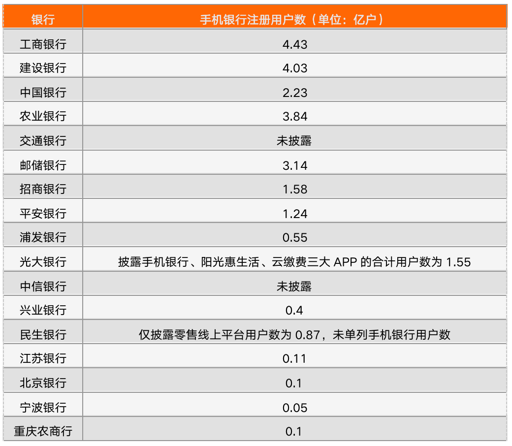 2、4家銀行存在數(shù)據(jù)未披露或未單獨(dú)披露手機(jī)銀行數(shù)據(jù),包括交通銀行、光大銀行、中信銀行以及民生銀行。