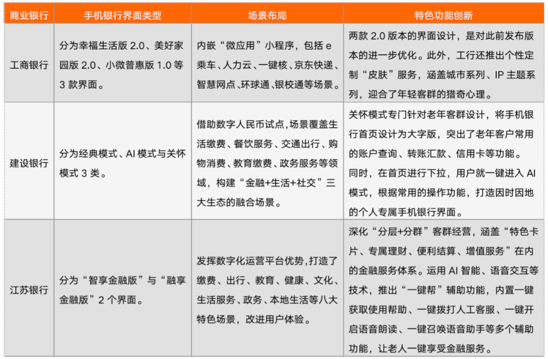 鑒于此,手機(jī)銀行必須做出差異化特色。近期,App適老化變革成為熱點(diǎn),各家銀行先后推出針對(duì)細(xì)分人群的多個(gè)專屬界面,包括適老化版本。從下述工商銀行、建設(shè)銀行以及江蘇銀行的最新做法,可以看出在場(chǎng)景融入與功能創(chuàng)新方面的探索實(shí)踐: