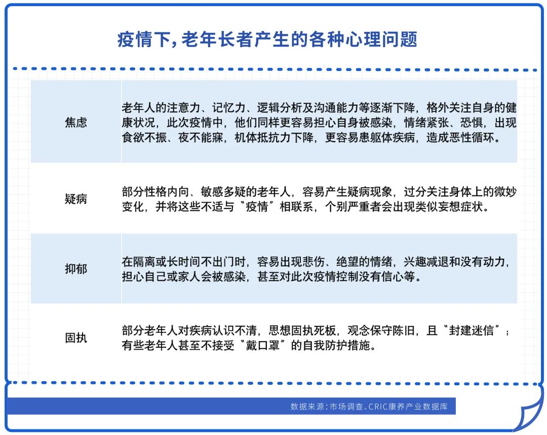 這些防控手段有效降低了感染風險,也導致老人較普遍出現焦慮不安情緒,如焦慮、抑郁、孤獨、憤怒、多疑等。