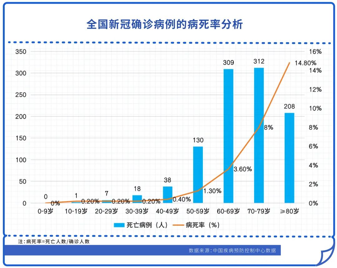 截至2020年2月11日中國疾控中心發布專項疫情流行病特征分析報告顯示,老年人屬于死亡病例的重點群體,隨著年齡提高,病死率逐漸攀升,60-69歲病死率為3.6%,70-79歲8.0%,80歲及以上為14.8%。
