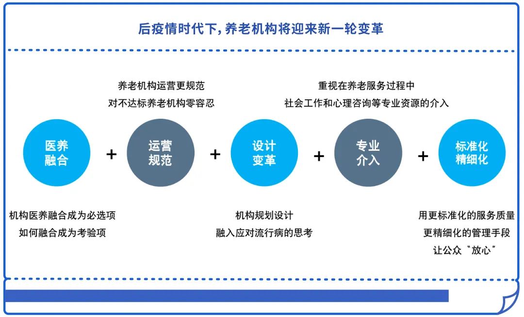 可以預見,后疫情時代下,養老機構將迎來新一輪變革:醫養融合將成為標配,養老機構運營將更加規范,機構設計將融入流行病思考,各種專業資源將介入養老服務全過程,同時養老服務質量與管理將更加標準化與精細化。