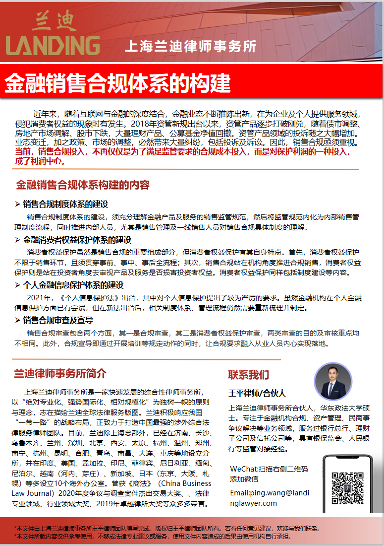 近年來,隨著互聯網與金融的深度結合,金融業態不斷推陳出新,在為企業及個人提供服務領域,侵犯消費者權益的現象時有發生。2018年資管新規出臺以來,資管產品逐步打破剛兌,隨著債市調整、房地產市場調解、股市下跌,大量理財產品、公募基金凈值回撤。業態變遷,加之政策、市場的調整,必然帶來大量糾紛,包括投訴及訴訟。銀行分支行及相關銷售機構,加強銷售合規管理極為必要。本次就金融銷售合規相關事項進行了系統梳理,包括銷售合規、個人信息保護及消費者權益保護。如需了解詳情,請與我們聯系。