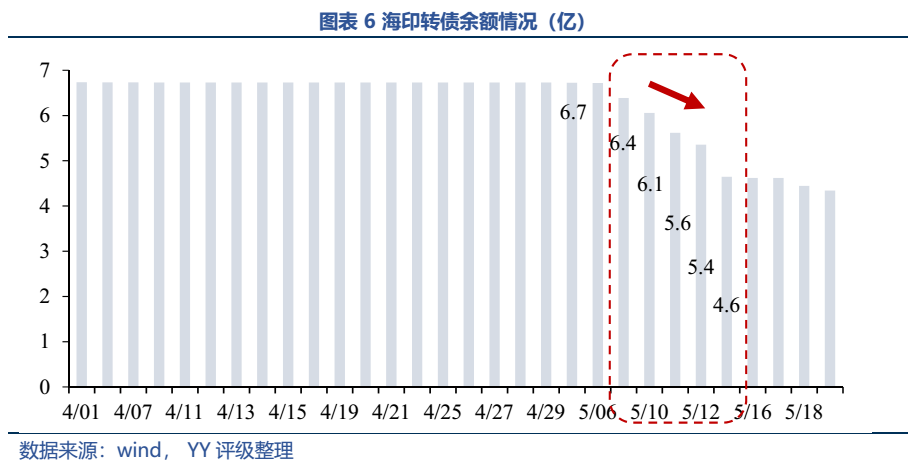 上周(5/9-5/13),海印轉債突然開始以每天3000-4000萬左右的速度快速轉股,僅僅5個交易日,未轉股余額由6.7億變為4.6億,轉債余額減少了2.1億。