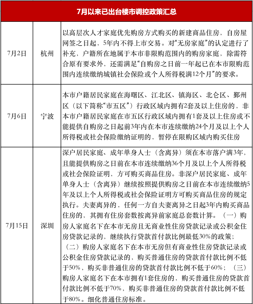 隨后,浙江臺(tái)州、麗水、海鹽等多個(gè)三四線(xiàn)城市發(fā)布樓市調(diào)控政策,掀起了新一輪三四線(xiàn)城市調(diào)控新周期。自7月熱點(diǎn)二線(xiàn)城市紛紛加碼調(diào)控至今,地方因城施策,調(diào)控正逐漸深入至三四線(xiàn)城市,未來(lái)調(diào)控大概率將繼續(xù)維穩(wěn),以更好地落實(shí)穩(wěn)地價(jià)、穩(wěn)房?jī)r(jià)、穩(wěn)預(yù)期的長(zhǎng)期目標(biāo)。