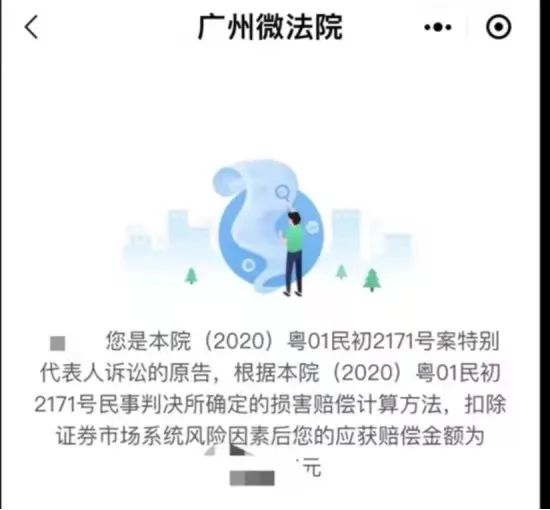 根據(jù)廣州中院《關(guān)于特別代表人訴訟原告應(yīng)獲賠償金額查詢(xún)方式的公告》,相關(guān)投資者可通過(guò)搜索進(jìn)入“廣州微法院”微信小程序,點(diǎn)選頁(yè)面下方“微訴訟”欄目,選擇“代表人訴訟”入口進(jìn)入代表人訴訟平臺(tái),實(shí)名認(rèn)證后,即可對(duì)自己的獲賠資格進(jìn)行查詢(xún),具體操作見(jiàn)下圖: