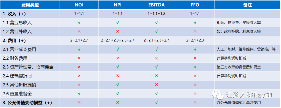 把兩項關于率的指標看完,我們再來看看關于金額的收益指標。NOI應該是當下大家聽的最多的了,那么為什么是NOI呢?凈營業收入(NOI)=總營業收入(EGI)-總營業費用(OPE),簡單來說也就是經營利潤,是經營性不動產由經營所帶來的收益。因為經營性不動產的價值是由收益程度決定,NOI自然也就成了度量不動產價值實現的金額指標。