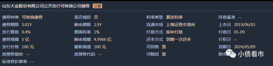 《小債看市》統(tǒng)計,目前大業(yè)股份僅存續(xù)一只“大業(yè)轉債”,債券余額5億元,票面利率0.4%,起息日為2019年5月9日,到期日為2024年5月9日。