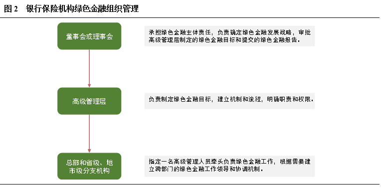 在銀行保險機構綠色金融業務的組織管理上,《指引》提到構建自上而下的管理流程:董事會或理事會承擔綠色金融主體責任,負責確定綠色金融發展戰略,審批高級管理層制定的綠色金融目標和提交的綠色金融報告;高級管理層應當根據董事會或理事會的決定,制定綠色金融目標,每年度向董事會或理事會報告綠色金融發展情況;總部和省級、地市級分支機構應當指定一名高級管理人員牽頭負責綠色金融工作。