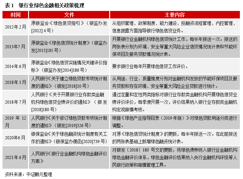2012年原銀監會發布《綠色信貸指引》指導銀行綠色信貸業務以來,原銀監會、人民銀行相繼發布了綠色信貸統計相關制度和綠色信貸業績評價制度。2020年以來,隨著國內綠色金融的繁榮發展,綠色金融取代綠色信貸,人民銀行、銀保監會相繼更新了綠色融資統計制度和綠色金融評價方案。