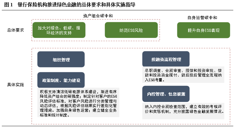 《指引》提出銀行保險業推進綠色金融工作的總體要求包括三個方面:加大對綠色、低碳、循環經濟的支持;防范ESG風險;提升自身ESG表現。最終推動銀行保險機構實現“資產組合碳中和”和“自身運營碳中和”。具體實施上,《指引》從組織管理、政策制度、能力建設、投融資流程管理、內控管理、信息披露方面全面指導銀行保險機構綠色金融業務。需要注意的是,《指引》是第一份保險業綠色金融發展指導文件,且對保險機構資產端和負債端均提出了綠色發展要求,保險機構要積極開展綠色保險和資金運用,加大對綠色低碳發展的風險保障和資金支持。