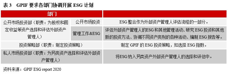 首先,在戰略層面,銀行保險機構可以將ESG納入公司發展戰略,并設立綠色金融發展業務目標,指導綠色金融業務的發展,還要向外界披露該戰略,以表達發展綠色金融的決心。在組織管理上,盡快設立專門的ESG委員會,指定管理人員,統籌綠色金融工作管理、監督等。在綠色金融業務開展過程中要注重各部門之間的協調,明確各部門的職責,以全球最大的公共養老金投資機構——日本政府養老投資基金(GPIF)為例,GPIF要求公開市場投資部、投資策略部、私人市場投資部以及其他資產管理相關部門協調實施 ESG計劃。