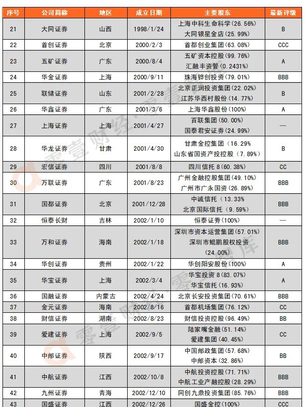 根據《證券公司分類監管規定》,證券公司分為A(AAA、AA、A)、B(BBB、BB、B)、C(CCC、CC、C)、D、E等5大類11個級別。A、B、C三大類中各級別公司均為正常經營公司,其類別、級別的劃分僅反映公司在行業內業務活動與其風險管理能力及合規管理水平相適應的相對水平。D類、E類公司分別為潛在風險可能超過公司可承受范圍及因發生重大風險被依法采取風險處置措施的公司。
