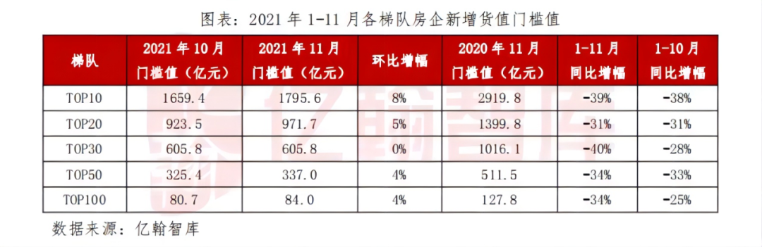 受其影響,為了續命、保命,房地產企業無疑會減少投資現金流出,拿地異常謹慎。進入2021年下半年,頭部房地產企業防御性拿地、甚至不再拿地。2021年1-11月統計數據來看,頭部房企新增貨值平均降低了30%-40%。