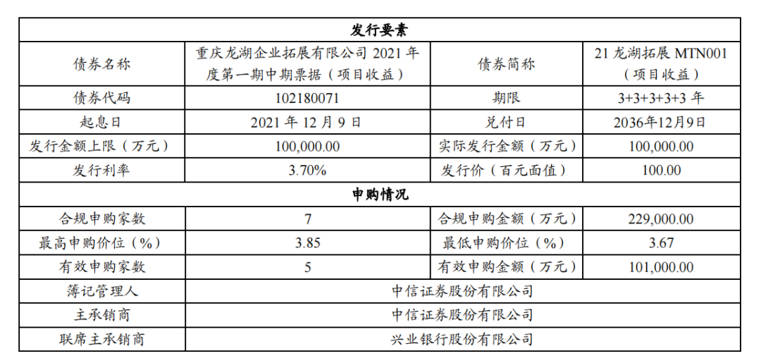 在此之前的12月10日,龍湖控股集團有限公司發布公告,公司間接附屬公司重慶龍湖企業拓展有限公司已于2021年12月7日及8日公開發行2021年度第一期中期票據,規模為人民幣10億元。期限15年,票面利率3.70%。