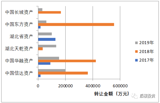 與去年相同,華融資產、長城資產兩家收購量依舊搶眼,作為一級市場主要持牌AMC受讓方占據接近80%的市場份額。而成立于2016年底的湖北天乾資產后來居上,受讓金額逐年攀高。