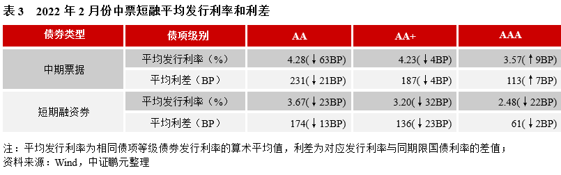 2022年2月份,中期票據的最高發行利率為7.50%,比上月最高發行利率上升50 BP;最低發行利率為2.35%,比上月最低發行利率下降72BP。與上月相比,AA級、AA+級別、AAA級的平均發行利率分別下降63BP、下降4BP和上升9BP;平均利差分別收窄21BP、收窄4BP和擴大7BP。2月份短期融資券的最高發行利率為7.00%,比上月最低發行利率降低30BP;最低發行利率為2.00%,與上月最低發行利率持平。就短期融資券發行級別來看,AA級、AA+級別、AAA級的平均發行利率分別降低23BP、32BP、22BP;平均利差分別收窄13BP、23BP、2BP。